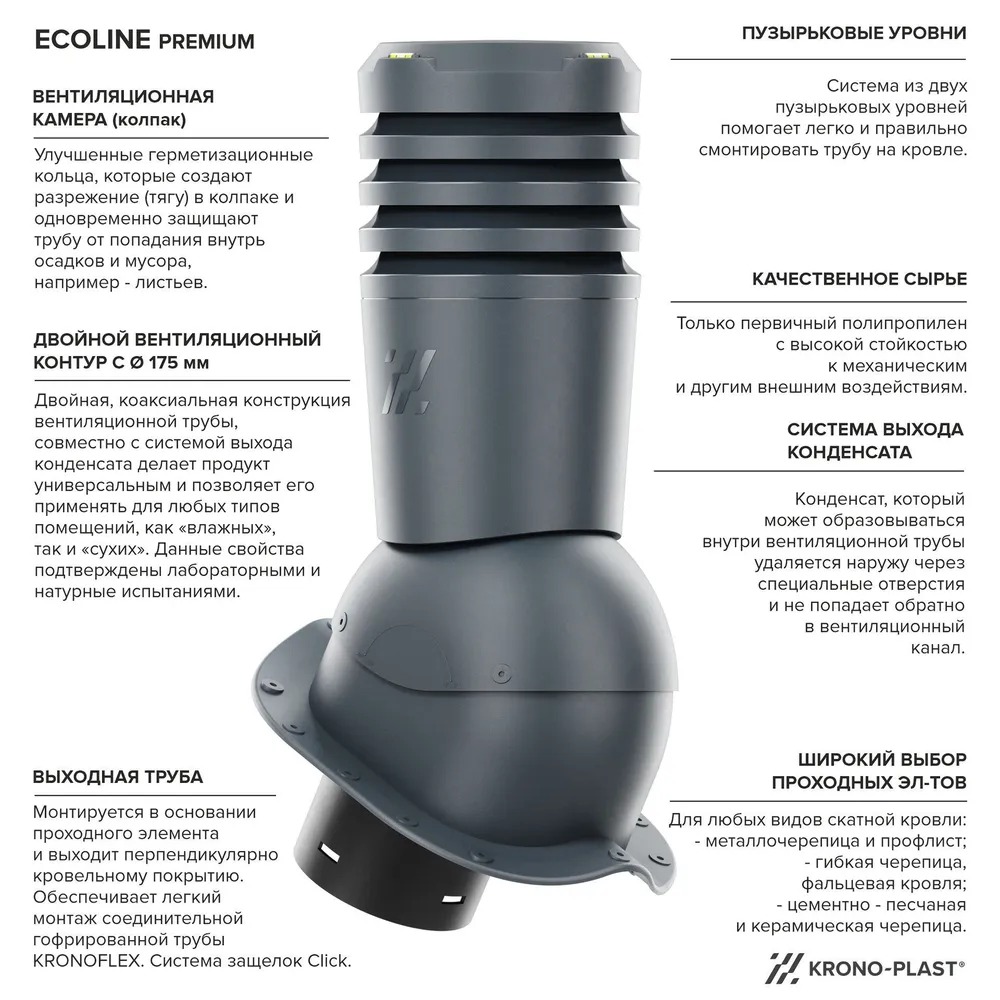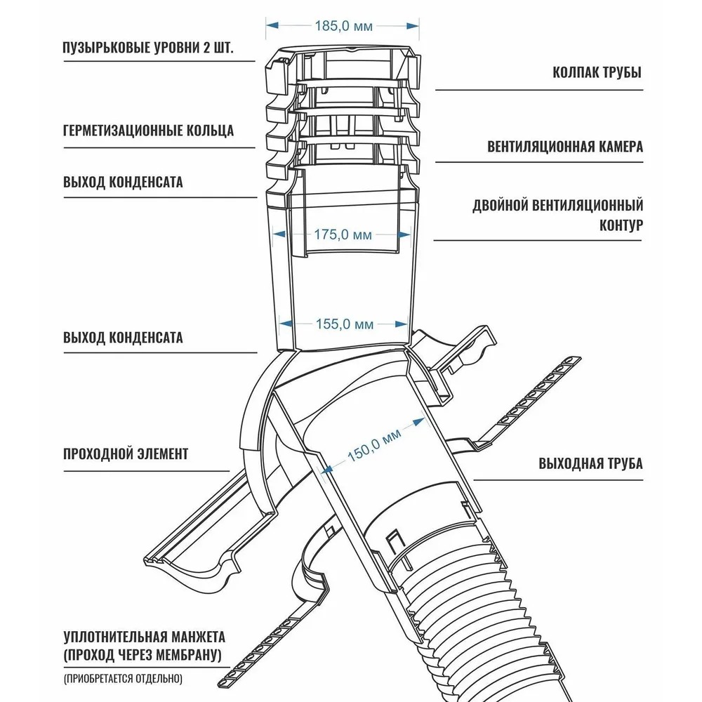 Характеристики ECOLINE premium Вентиляционные выходы ECOLINE имеют универсальность применения для любых помещений (для условно "влажных" и "сухих" помещений) за счет двойной (коаксиальной) конструкции (труба в трубе). Внутренняя труба всегда "теплая", а со стенок наружной трубы влага удаляется наружу через систему выхода конденсата. * Для улучшения аэродинамических свойств вентиляционный выход имеет плавное увеличение диаметра к верхней части, по сравнению с номинальным диаметром и улучшенную, аэродинамическую конструкцию лепестков колпака. Конструкция ECOLINE premium Применение двойной "коаксиальной" конструкции в ECOLINE premium с системой выхода конденсата по функционалу соответствует утепленной версии вент. выхода с теплоизоляцией 10 мм. (при применении в умеренном климате). Важно! Обильное конденсатообразование в зимний или демисезонный период, в большинстве случаев, происходит вследствии недостаточного или полностью отсутствующего утепления вентиляционного канала, проходящего через холодное чердачное помещение. На что подходит продукция ECOLINE PN? На металлочерепицу: Монтеррей, Супермонтеррей; Classic (GRANDLINE); Ламонтерра (МеталлПрофиль); М28 (УНИКМА); СМ Классик (STYNERGY); Стокгольм (Аквасистем). Код цвета RAL 01 8017 коричневый 02 9005 черный 03 7024 серый 04 3009 красный 05 6020 зеленый 06 8004 терракотовый 07 7019 темно-коричневый 09 7016 темно-серый