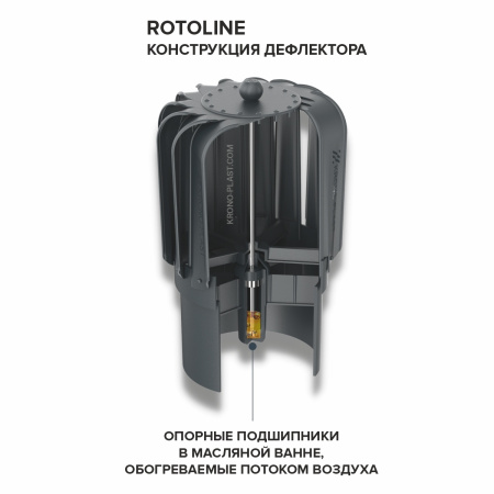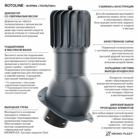 Вентиляционные выходы (трубы) KRONO-PLAST - ROTOLINE с крутящимся дефлектором (турбодефлектором) предназначены для вывода через кровлю систем вентиляции помещений. Их монтаж на кровлю осуществляется нижней частью - проходным элементом, который идет в комплекте. Продукция подбирается по типу (профилю) кровельного покрытия. На что подходит продукция ROTOLINE UNI? Для любой волны (профиля) металлочерепицы или профлиста - универсальный проходной элемент (UNI) с EPDM манжетой в комплекте Подходит для любой металлочерепицы, а для профлиста с высотой профиля не более 35 мм. Особенности ROTOLINE: 1) Сверхлегкий крутящий дефлектор из полипропилена с высокой стойкостью к ударам и механическим воздействиям! 2) Подшипниковый узел в маслянной ванне с подогревом проходящим воздухом 3) Максимально возможная герметичная конструкция лепестков турбодефлектора. 4) Система выхода конденсата наружу (по контуру в нижней части юбки) 5) Сбалансированная легкая конструкция дефлектора работает даже при самой низкой скорости ветра (в отличии от стальной конструкции). 6) Нижняя часть вент. выхода - выходная труба, расположена перпендикулярно кровельному покрытию и ниже его. Такое решение обеспечивает точный проход через кровельную мембрану и уплотнительную манжету (PPM), возможность применения конденсатосборника (SKR), обратного клапана (ZZ) и гибких шлангов (KF,KFP) с креплением на защелках Click. Также, удобное обслуживание коммуникаций под кровлей после монтажа. 7) Продукция изготавливается только из первичного полипропилена (не АБС-пластик) с высокой стойкостью к УФ и не становится хрупкой при наружной эксплуатации в течении всего срока службы вашей кровли. Код цвета RAL 01 8017 коричневый 02 9005 черный 03 7024 серый 04 3009 красный 05 6020 зеленый 06 8004 терракотовый 07 7019 темно-коричневый 09 7016 темно-серый